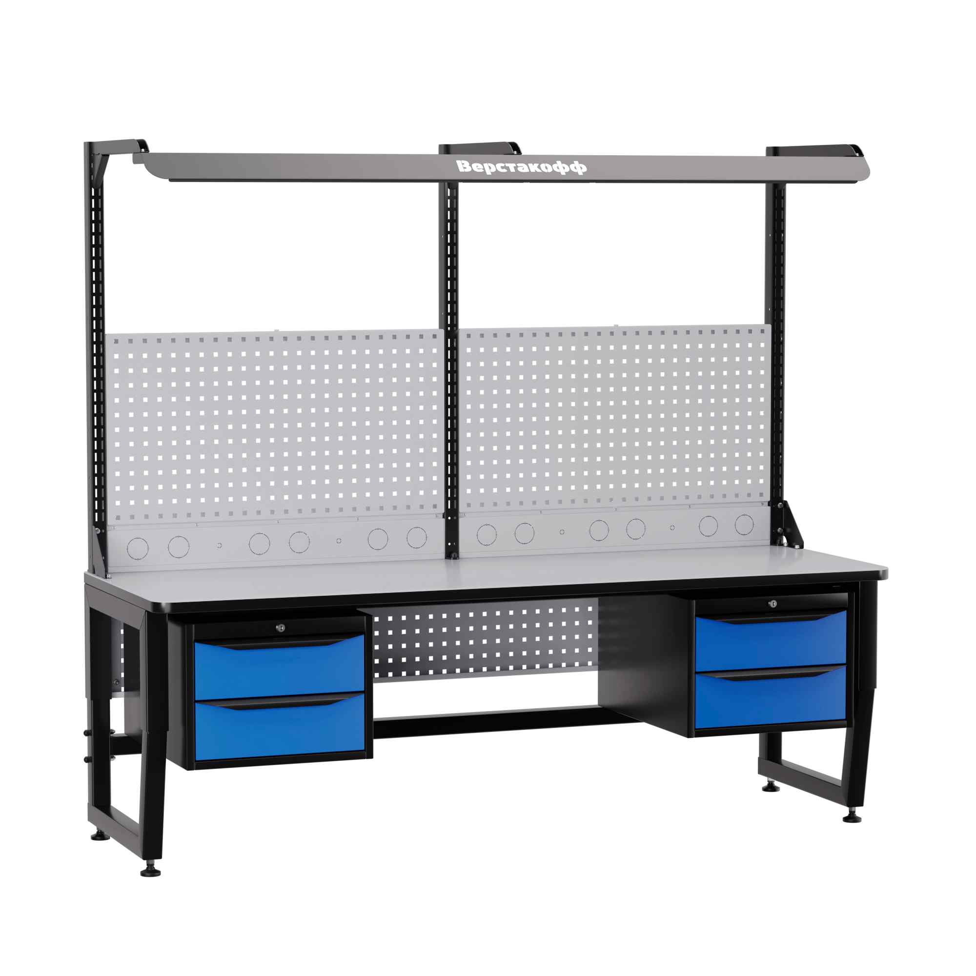 Для наилучшей освещенности при работе с мелкими электронными компонентами рабочее место комплектуется блоком освещения. В его составе - специальный промышленный светильник с необходимой цветовой температурой и световым потоком, обеспечивающим оптимальные условия работы. Блок освещения располагается над рабочей поверхностью на регулируемых (по высоте и по вылету) кронштейнах<br />