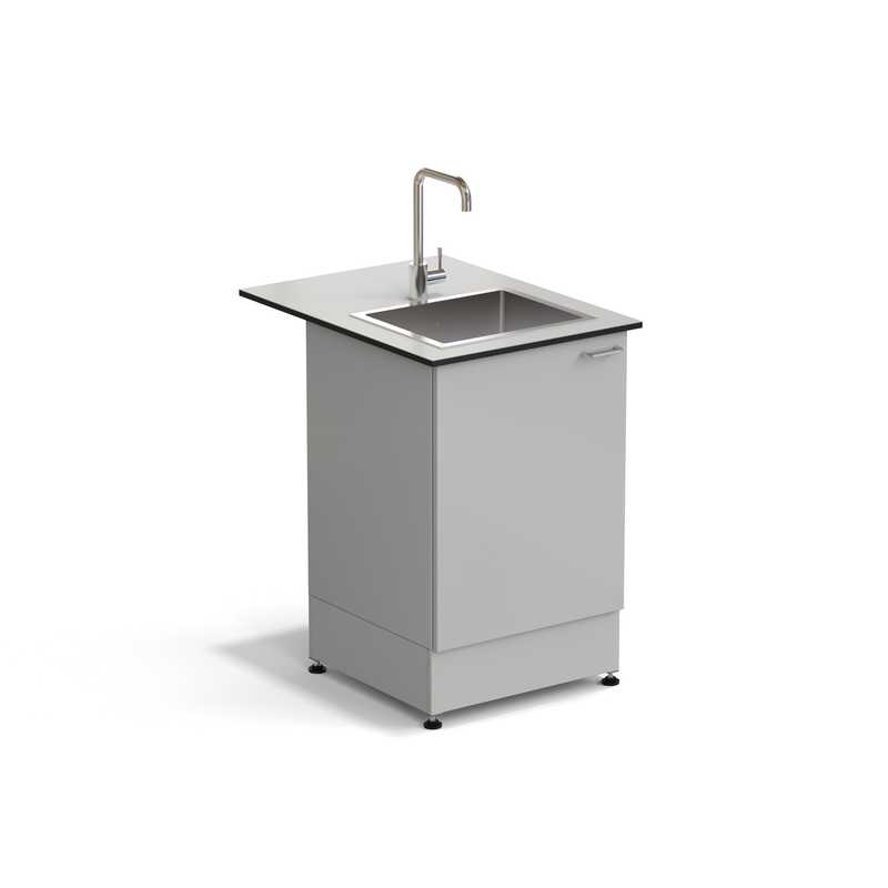 Стол-мойка состоит из металлического каркаса с установленной дверью и комплекта сантехнических принадлежностей.