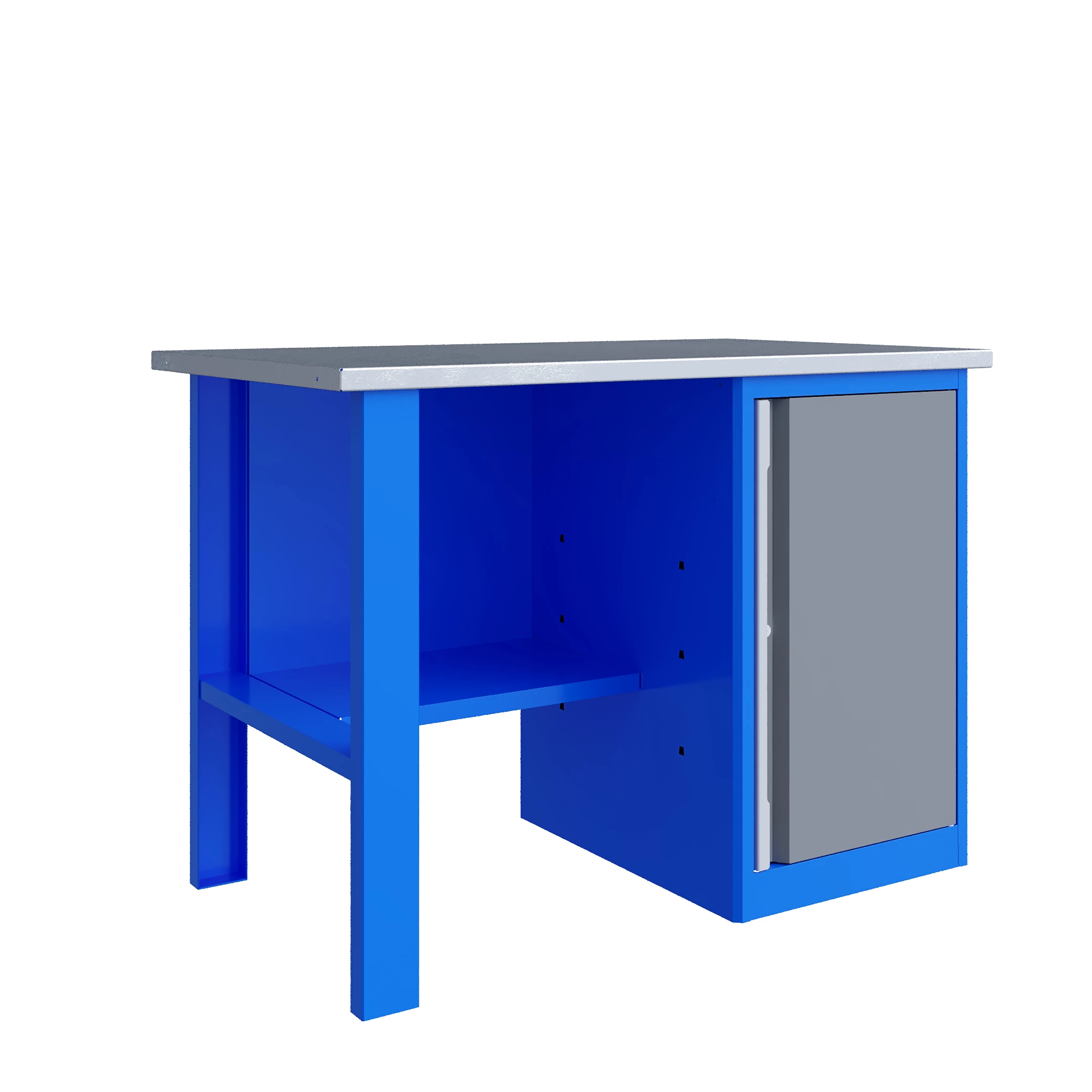 Верстак серии Technic 121.17.1 состоит из столешницы шириной 1196 мм, опоры, тумбы P7 с дверью и двумя полками и полки-стенки.