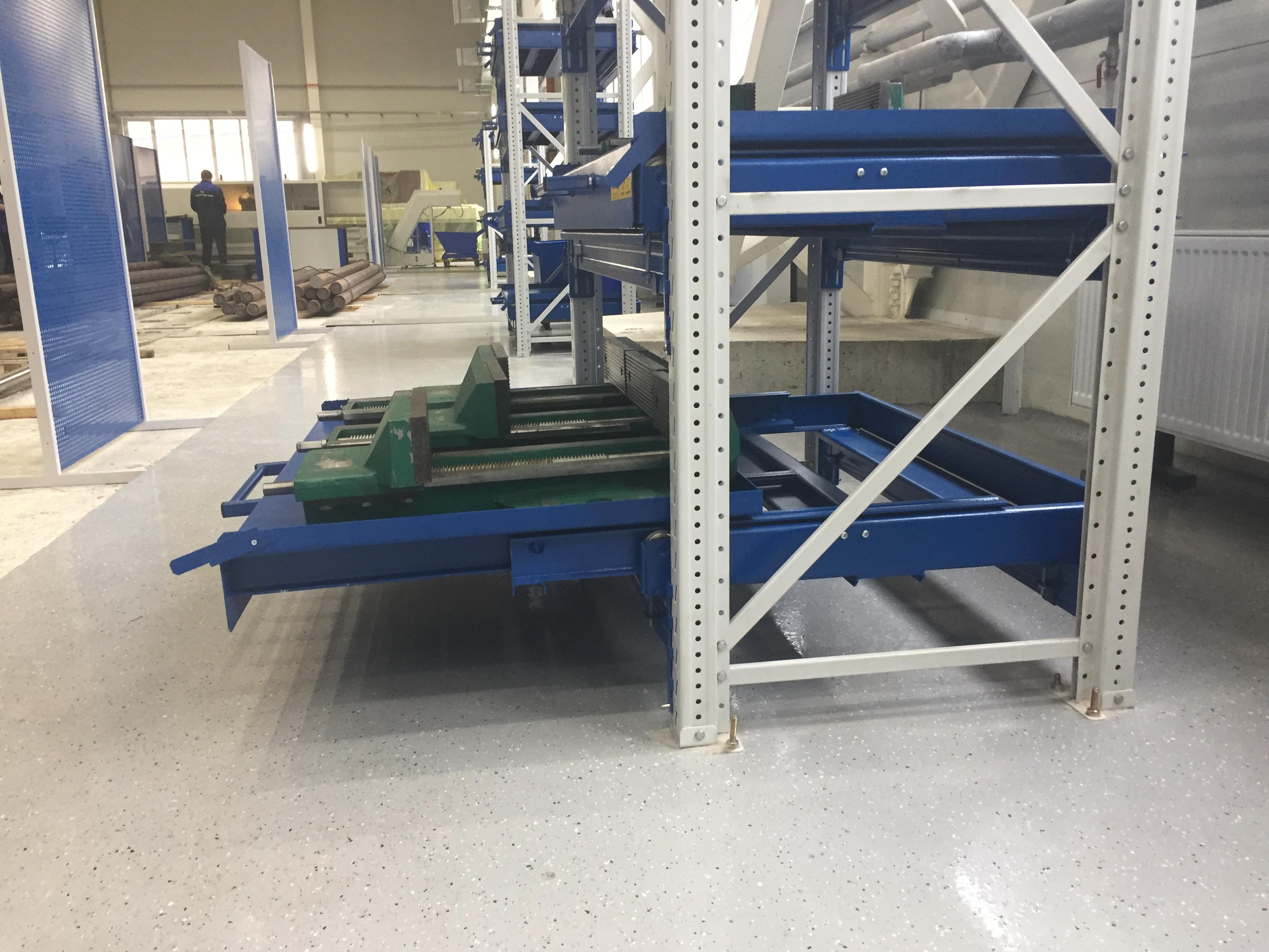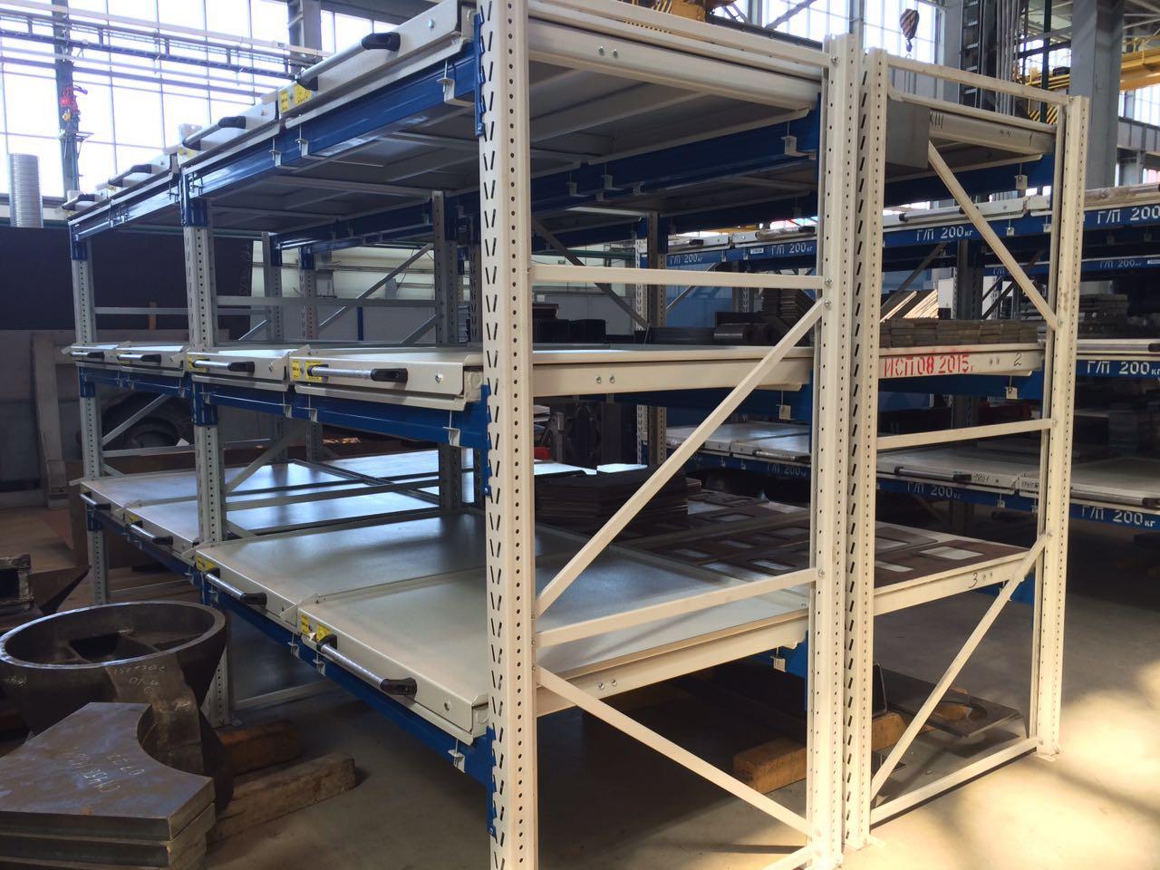 - Выкатные платформы на шарикоподшипниковых направляющих, закрепленных на балках стеллажа при помощи стяжных кронштейнов (4 шт/платформу), с ручкой и фиксатором (блокировка выкатывания)