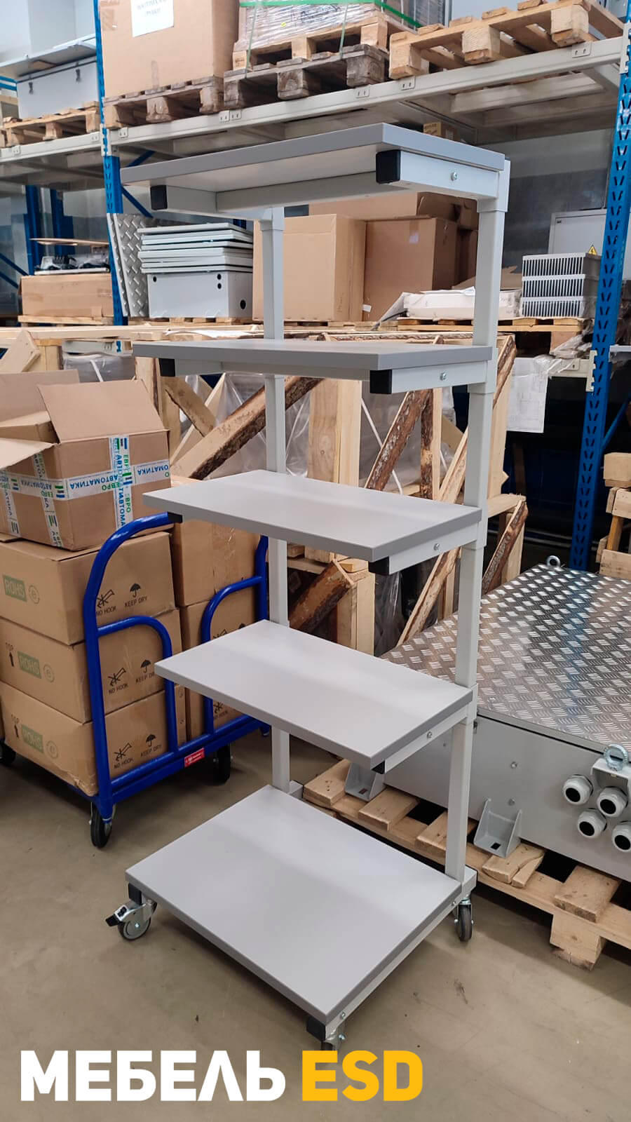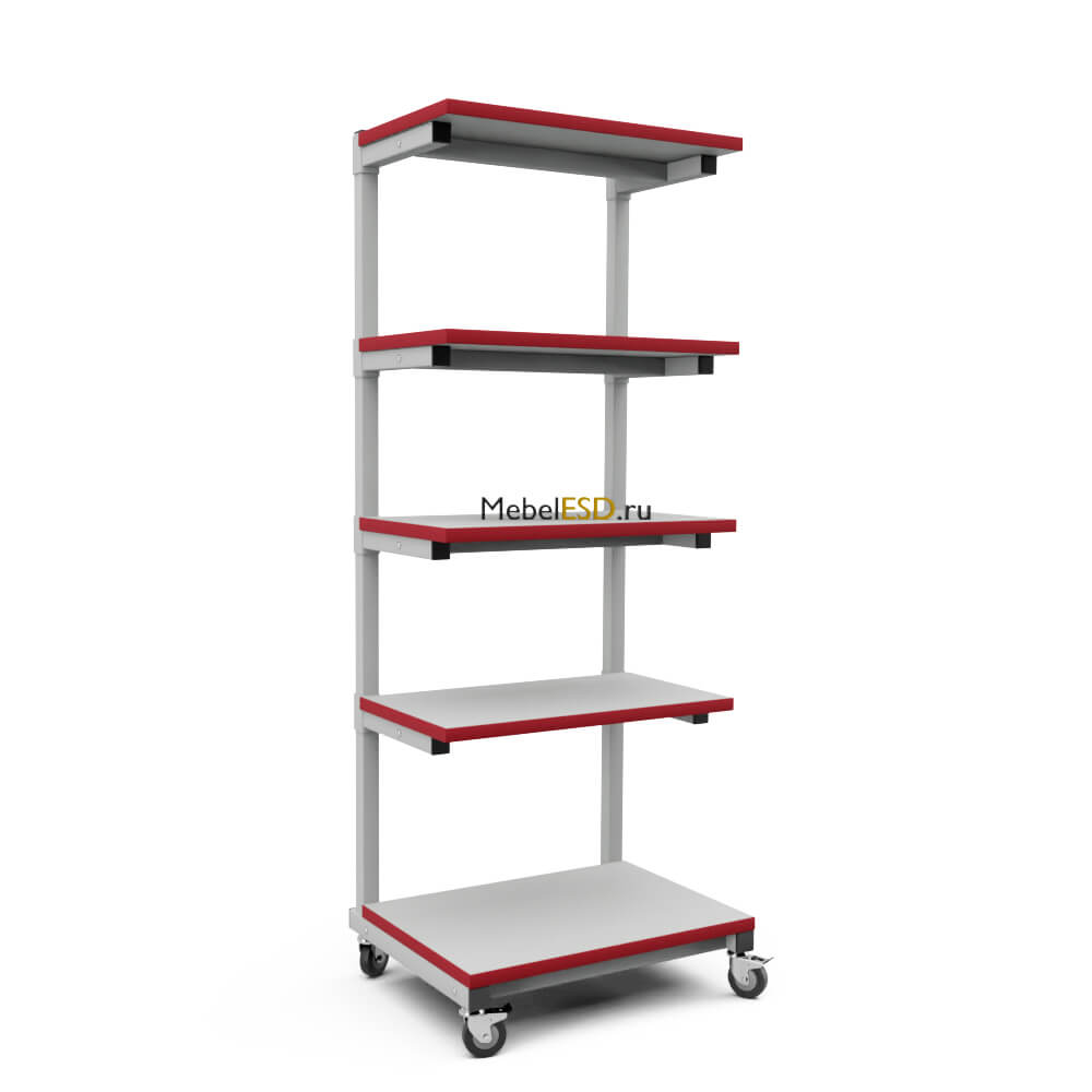 Стойка антистатическая согласно требованиям стандарта ГОСТ IEC 61340-5-1-2019, на лицевой стороне имеет маркировку esd иконка - знак ESD (Electrostatic sensitive device), обозначающий работу с материалами чувствительными к электростатическому разряду. В комплект поставки антистатической стойки входит набор ESD колес. В комплект поставки антистатической стойки входит ESD набор для заземления полок — болт и провод с клеммой.