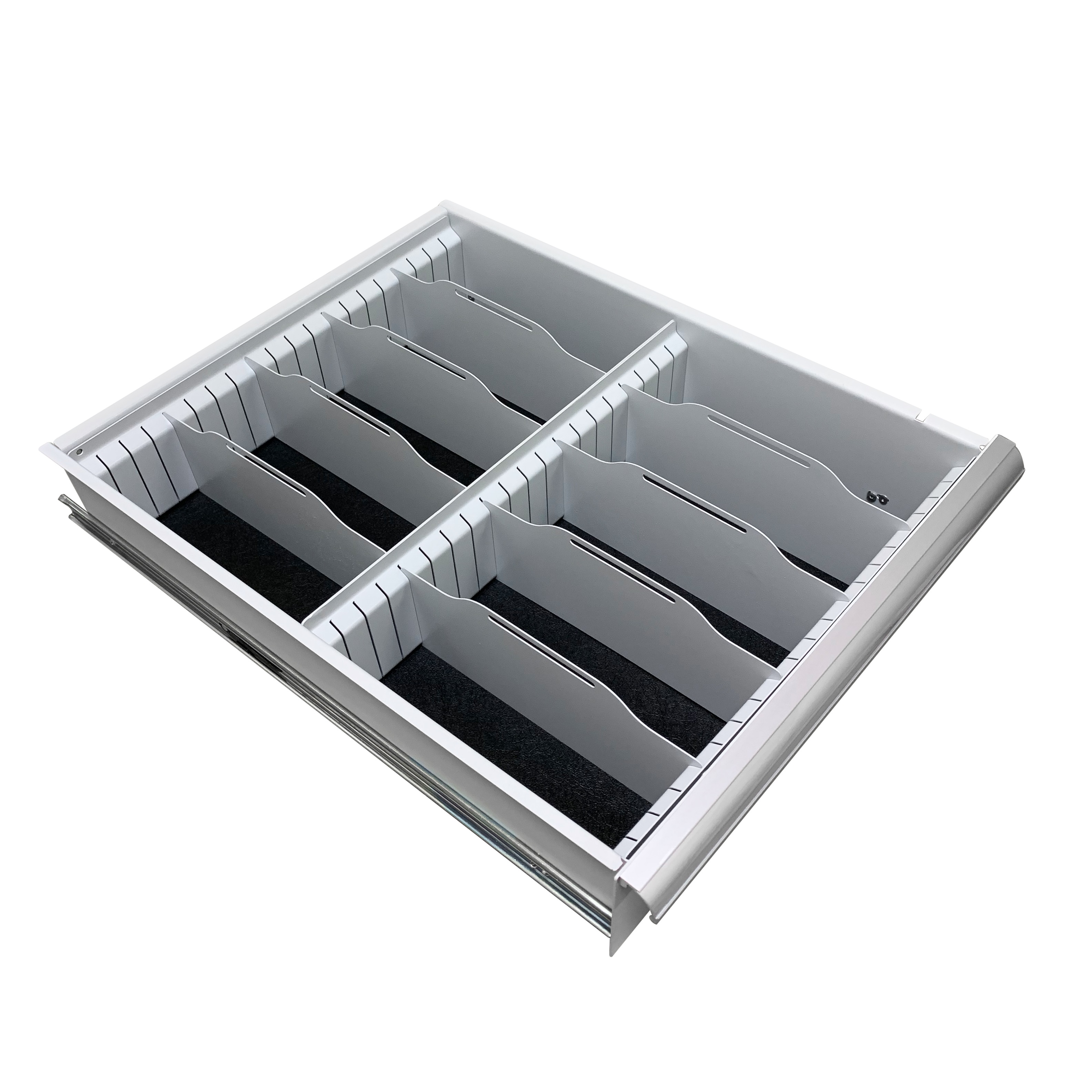 Используется для упорядоченного хранения комплектующих. Конструкция поперечных перегородок, которые имеют прорези по всей длине с шагом 20 мм, позволяет выстроить продольные перегородки таким образом, чтобы обеспечить оптимальный размер ячеек для разных по габариту материалов. Максимальное количество ячеек при использовании полного комплекта перегородок — 10 шт.